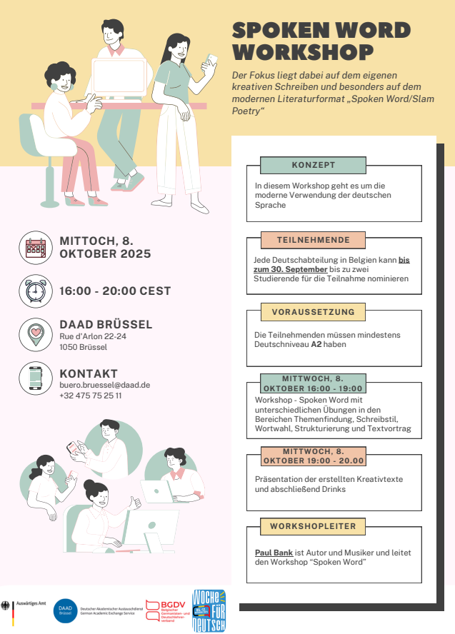 Das DAAD-Büro Brüssel veranstaltet unter Leitung von Michael Hörig im Rahmen der Woche für Deutsch einen Workshop für deutschsprachige Spoken Word Poetry. Der Workshop findet in den Räumlichkeiten des DAAD in Brüssel statt und wird von dem Poetry Slammer Paul Bank aus Stolberg geleitet, der in den letzten beiden Jahren auch schon Poetry Slams in Gent und Lüttich geleitet […]